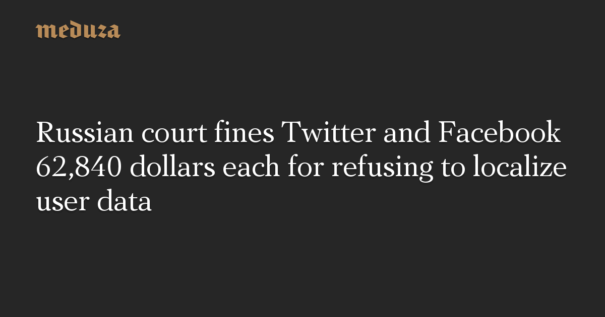 A Moscow district court has fined Twitter and Facebook 4 million rubles ($62,840) each for refusing to store Russian users’ data on servers located inside Russia. According to the news agency RIA Novosti, the two American tech giants faced fines as high as 6 million rubles ($92,260) for noncompliance with Russia’s data-localization requirements.