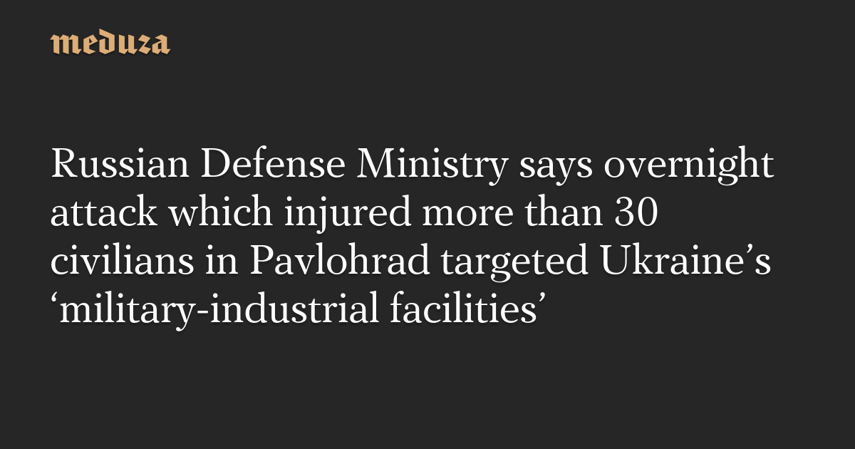 Russian Defense Ministry says overnight attack which injured more than 30 civilians in Pavlohrad targeted Ukraine’s ‘military-industrial facilities’