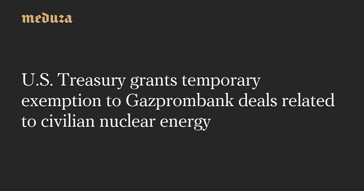 The U.S. Treasury Department has temporarily suspended sanctions on transactions with Gazprombank related to civilian nuclear energy. The special exemption expires on June 30, 2025. The government’s decision applies to operations conducted for projects launched before November 21, 2024 — before the United States imposed sanctions on Gazprombank, one of the main channels for payments for Russian oil and gas.