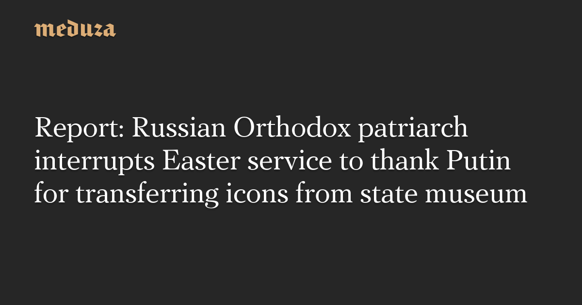 Patriarch Kirill interrupted the Easter service at the Cathedral of Christ the Savior in the early hours of April 12 to thank Vladimir Putin for transferring two icons from the Tretyakov Gallery to the Russian Orthodox Church, the independent Russian investigative outlet Agentstvo reported.