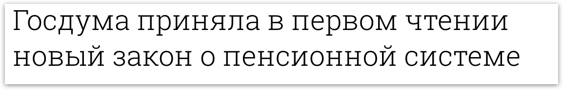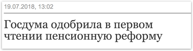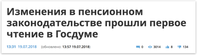 Despite calls from some minority-party deputies, the State Duma voted overwhelmingly on Thursday to adopt the first reading of controversial legislation that would raise Russia's retirement age from 60 to 65 for men by 2028, and from 55 to 63 for women by 2034. Public opinion polls show that Russians largely oppose this proposal. After the reforms were announced, Vladimir Putin’s re-election rating slipped to 54 percent in late June — his lowest score since before Russia annexed Crimea. Deputies were reportedly told to refrain from criticizing Vladimir Putin during debate on the legislation’s first reading. The final vote tally was 328 in favor and 104 opposed. Reporting the news that State Duma lawmakers have adopted the first reading of the legislation, several pro-Kremlin and government-controlled news outlets ran headlines that left out the most important thing about the bill: it would raise the retirement age.