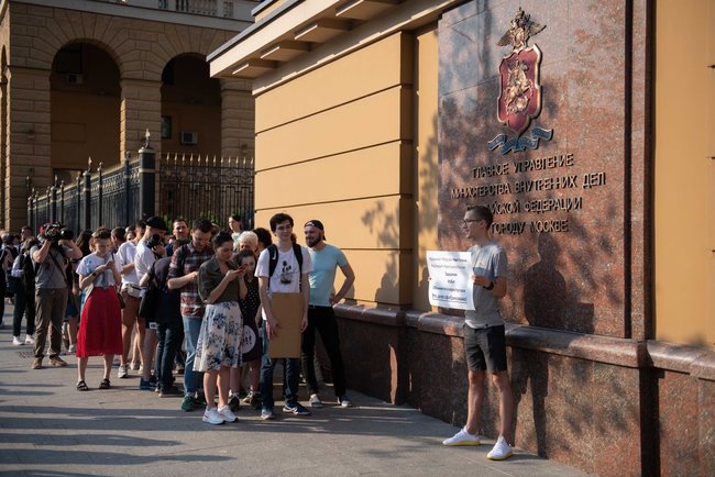 On the evening of June 7, protesters began to gather outside the headquarters of Moscow’s Interior Ministry branch to demand the release of Meduza correspondent Ivan Golunov. Because any public demonstration involving more than one person must receive advance government approval to have legal status in Russia, the picketers have formed a long line to take turns holding up signs by the building. Police officers arrested several of the picketers but later released them without charges. Ivan Golunov was arrested on accusations of large-scale attempted drug dealing. He argues that police planted packets of narcotics in his backpack and his home.
