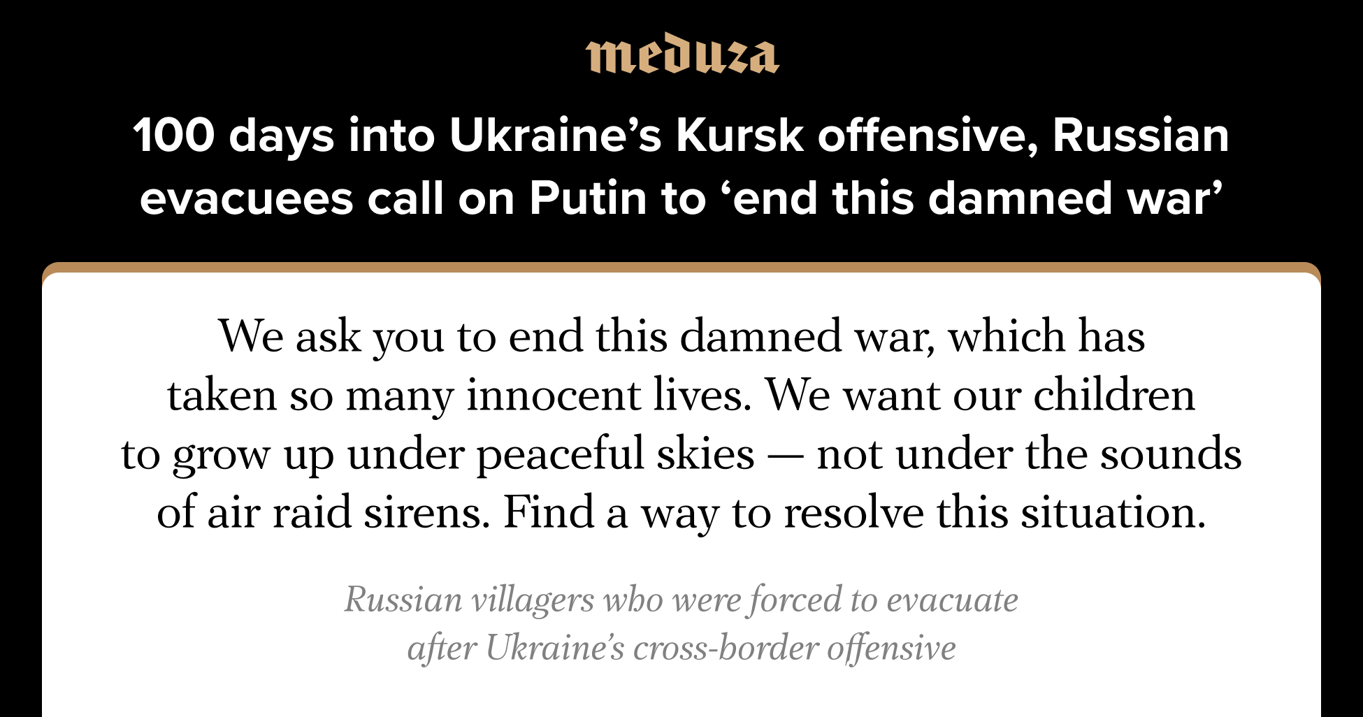Desperate evacuees from Olgovka, a village in Russia’s Kursk region that’s seen ongoing fighting throughout Ukraine’s cross-border offensive that began in August, released a video appeal to Vladimir Putin this week asking him to “end this damned war.” The group’s spokesperson told the Russian president that they’ve been “living in hell for three months” and implored him to “listen to the people of the borderland.”