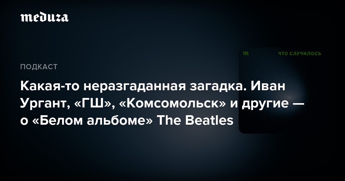 Гости подкаста: Иван Ургант (телеведущий и битломан со стажем), Михаил Давыдов (историк и битломан с еще большим стажем), Антон Маскелиаде (электронный музыкант и теперь, кажется, тоже битломан), Даша Дерюгина (играет и поет в группе «Комсомольск»), Евгений Горбунов (играет и поет в проектах «ГШ» и «Интурист»), Владимир «Корней» Корниенко (24 ноября сыграет весь «Белый альбом» живьем вот здесь).