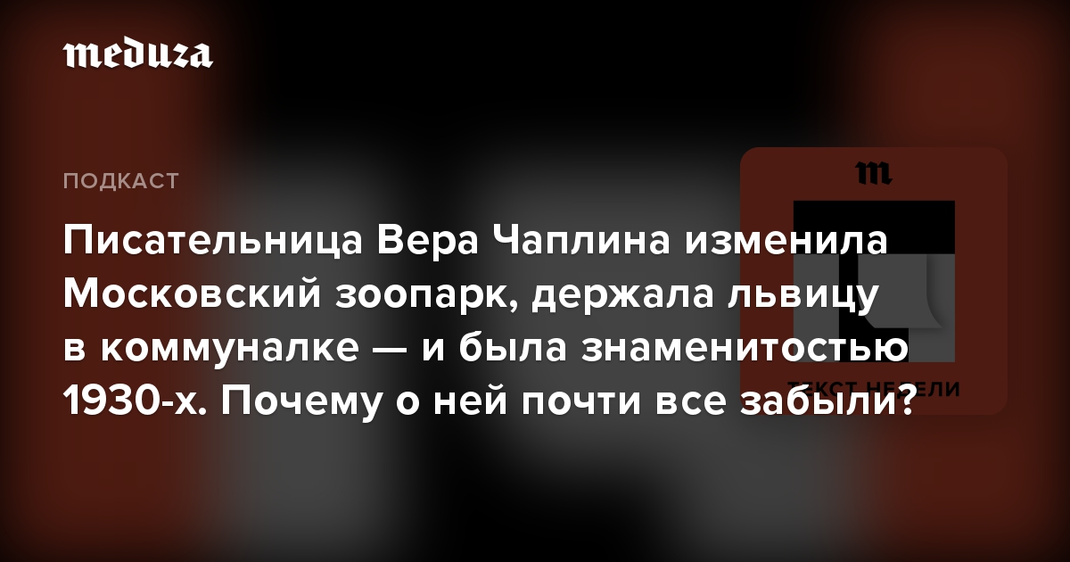 Специальный корреспондент «Медузы» Кристина Сафонова в подкасте «Текст недели» рассказывает историю Веры Чаплиной — писательницы, державшей диких зверей в коммуналке. Она долгое время работала в Московском зоопарке в 1920-х — 1940-х годах и придумала «площадку молодняка». На этой площадке вместе жили и играли детеныши медведей, собак динго, львов, а еще там были поросята и козлята — Вера Чаплина помогала животным, которые по разным причинам остались одни.
