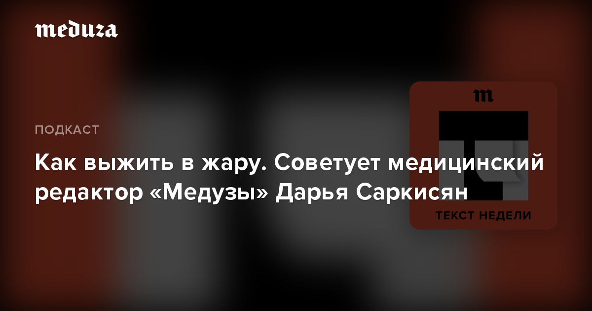 Когда за окном палящее солнце и столбик термометра поднимается до рекордных температур, все новости уходят на второй план и главный вопрос только один: «Как пережить эту невыносимую жару?». Специально по такому случаю медицинский редактор «Медузы» Дарья Саркисян составила полезную инструкцию. Что пить и чего не есть, как правильно охлаждаться, чем помочь детям и людям пожилого возраста и как уберечь домашних животных — обо всем этом она рассказывает в подкасте «Текст недели».