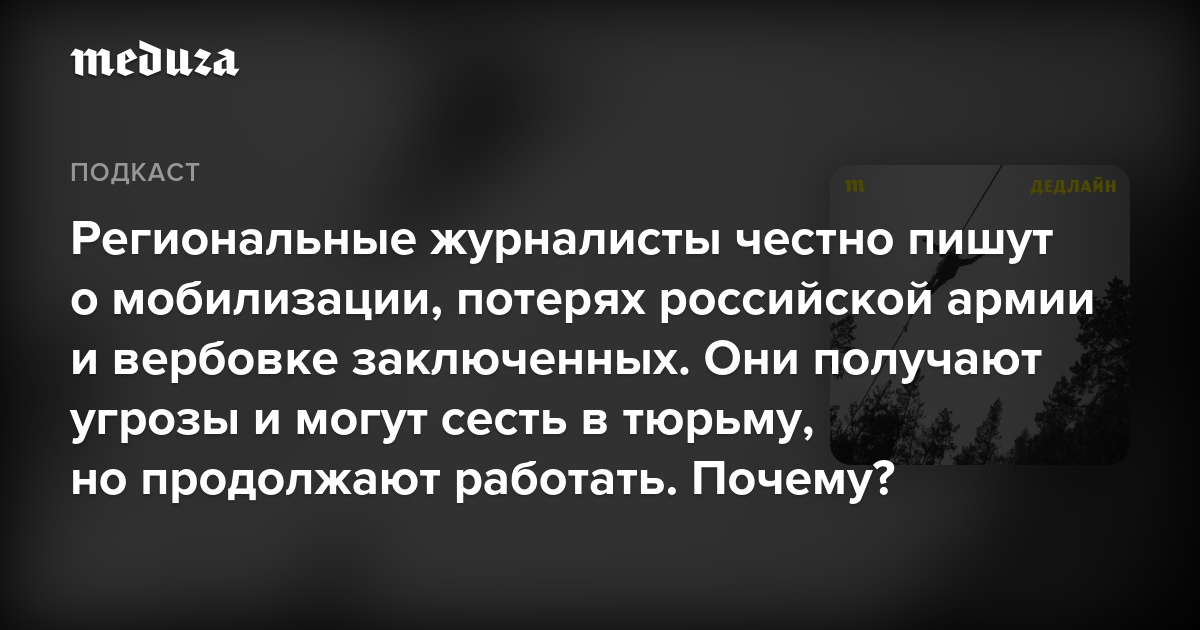 🎧 «Дедлайн» — подкаст «Медузы» о том, как изменилась работа медиа и журналистов с началом войны в Украине. Слушайте на всех основных аудиоплатформах и подписывайтесь, чтобы не пропустить новые эпизоды.