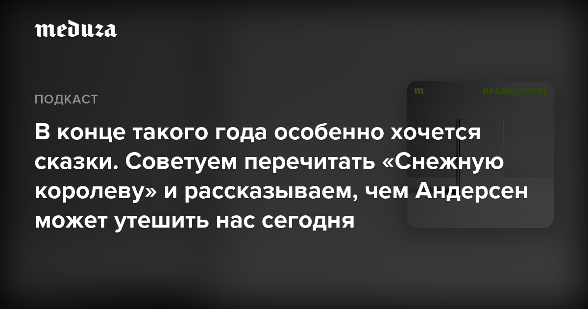 Какое произведение школьной программы перечитать в конце этого ужасного года? «Снежную королеву»! Литературный обозреватель «Медузы» Галина Юзефович и ее соведущий, учитель Александр Серапионов, рассказывают, почему сказка Андерсена, пожалуй, лучшее чтение в этот Новый год.