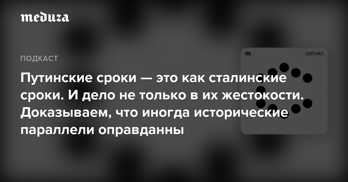 «Сталинские сроки» (они же в этом случае «путинские») — это репрессии, которые основаны не на правовых, а на политических принципах. Люди подвергаются преследованиям не за то, что они (якобы) сделали, а фактически за то, что они говорят или даже думают. Политическая «неблагонадежность» и даже ассоциация с «неблагонадежными» людьми и организациями сами по себе приравниваются к преступлению. Об этом — новый выпуск подкаста «Сигнал».