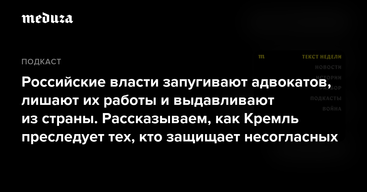 В этом эпизоде говорим о том, как в современной России уничтожается адвокатура, — со специальным корреспондентом «Медузы» Кристиной Сафоновой. Вместе со спецкором Светланой Рейтер она выпустила большой материал о том, как Кремль перешел к массовому преследованию несогласных — и как власти хотят, чтобы этому никто не мешал.