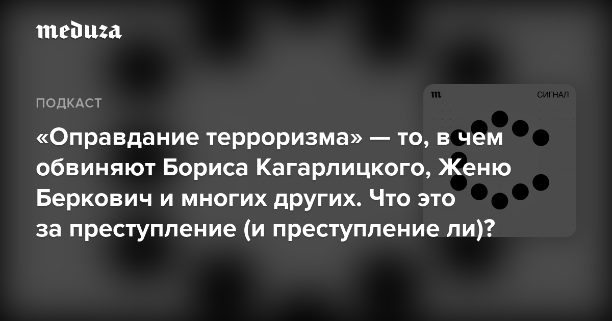 «Оправдание терроризма» — одна из главных политических статей Уголовного кодекса РФ (очень рекомендуем прочесть карточки «Медузы» о ней). По этой статье предъявили обвинение Борису Кагарлицкому — ключевой фигуре российского левого движения. 26 июля его арестовали на два месяца. По той же статье сидят под арестом режиссерка Женя Беркович и драматург Светлана Петрийчук. По ней же осуждены учитель из Коми, блогер из Москвы, врач из Благовещенска и многие-многие другие.