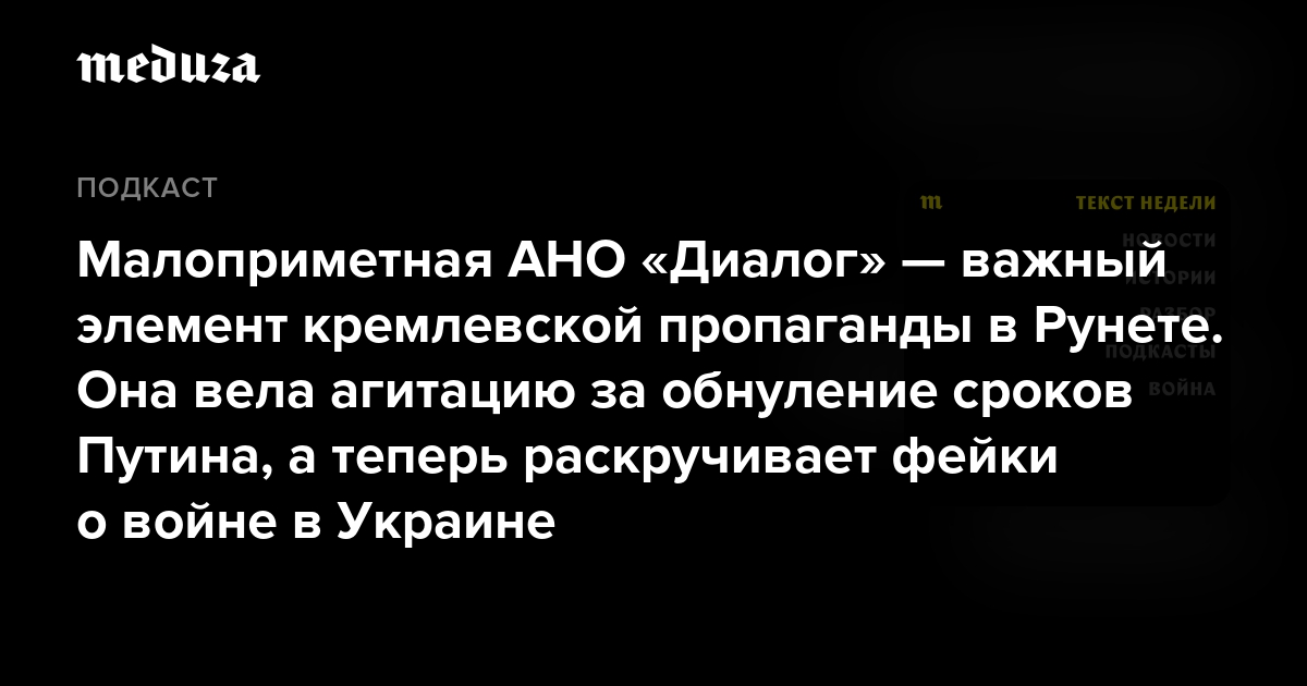 Как выяснили в своем расследовании «Медуза», «Важные истории» и The Bell, одну из ключевых ролей в сфере пропаганды в Рунете играет с виду не очень приметная автономная некоммерческая организация (АНО) «Диалог». Изначально она создавалась для выстраивания обратной связи между властью и обществом. Постепенно ее функции значительно расширились: «Диалог» занимался пиаром властей во время пандемии ковида, кампании по обнулению президентских сроков Владимира Путина, а теперь плодит военные фейки и оправдывает преступления Минобороны РФ в Украине.