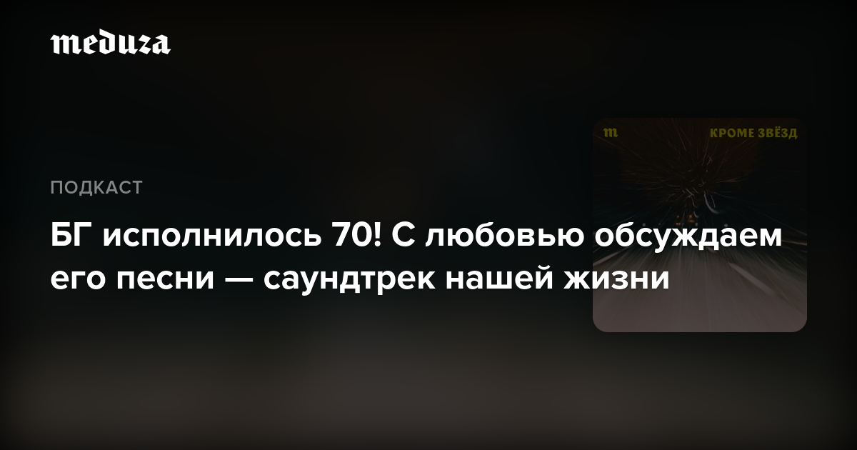 Борису Гребенщикову исполнилось 70! К юбилею журналист Александр Филимонов и музыкант Евгений Федоров записали специальный эпизод «Кроме звезд». Ведущие признаются в любви БГ, обсуждают его недавний мини-альбом «Богрукиног» и восхищаются тем, как Гребенщикову удается одной-двумя фразами поставить диагноз происходящему.