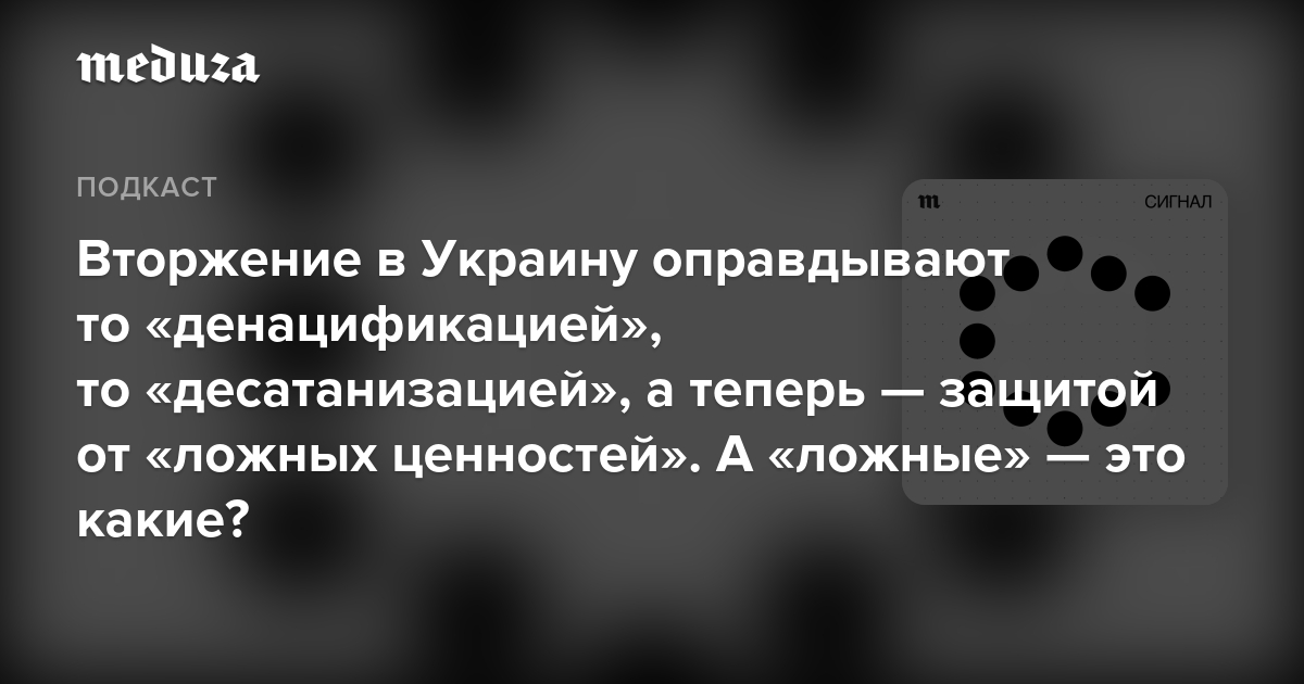 Но в последние месяцы российские власти все реже говорят про «денацификацию» и все чаще — про «защиту традиционных ценностей». Есть даже обобщенное название «угроз», которым якобы подвергается российское общество по мнению чиновников. Это название регулярно использует в том числе лично Владимир Путин — «псевдоценности».