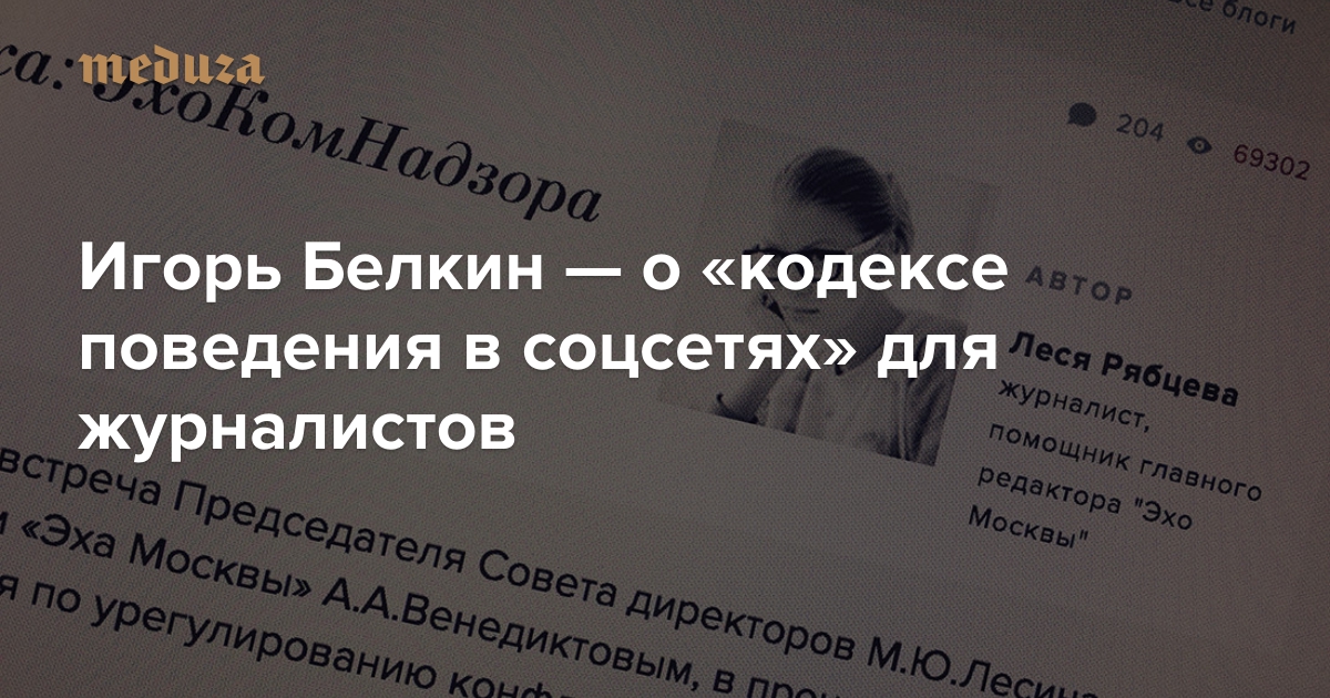 Конфликт между Лесиным и «Эхом» едва не привел к увольнению Венедиктова, но в итоге проблему удалось решить: Плющева временно отстранили от эфира, а помощница главреда радиостанции Леся Рябцева взялась за разработку «кодекса поведения журналистов в социальных сетях» для всего холдинга «Газпром-медиа». По просьбе «Медузы» об инициативе Рябцевой размышляет Игорь Белкин — создатель твиттера @lentaruofficial и самый известный в России специалист по панк-SMM.
