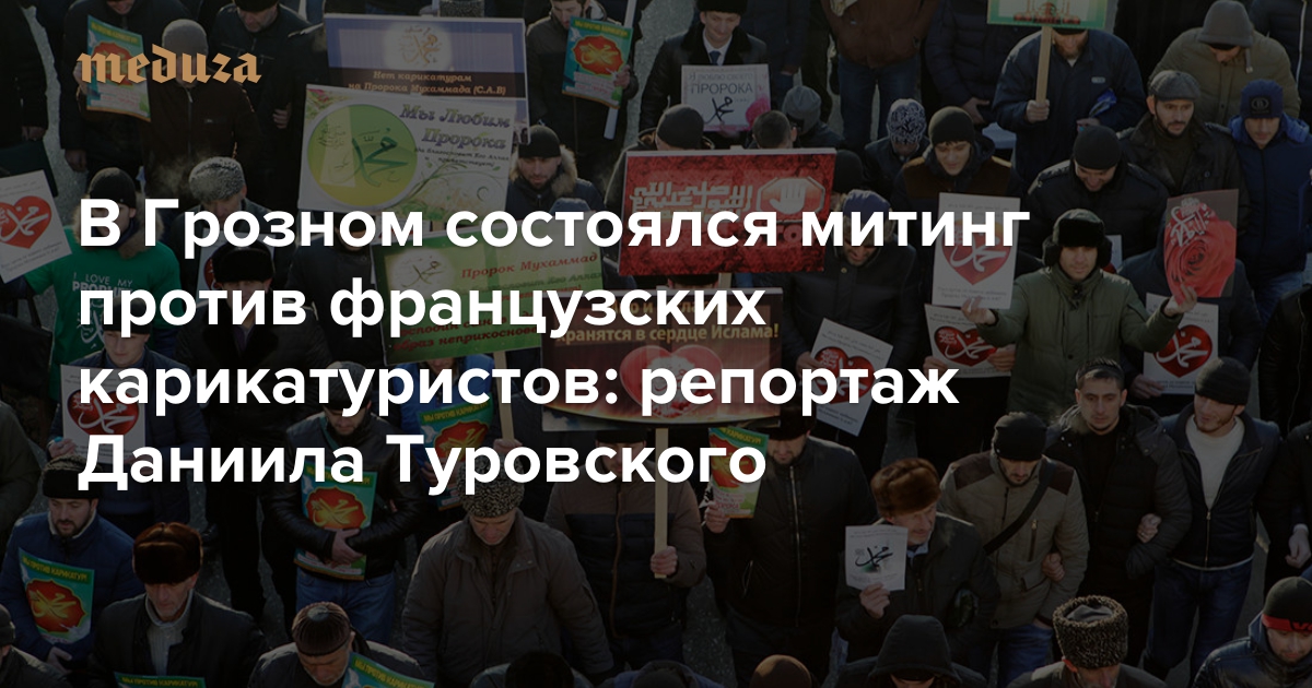 В Грозном в понедельник, 19 января, состоялся масштабный митинг «Любовь к Пророку Мухаммеду и протест против карикатур». Глава Чечни Рамзан Кадыров в своем инстаграме обещал собрать на акцию миллион человек — и тем самым дать символический ответ миллионам французов, вышедших на улицы в память о погибших в недавних терактах. В итоге, по данным МВД России, в Грозном митинговали 800 тысяч человек (по подсчетам «Би-би-си» — 350 тысяч). Протестующие несли плакаты «Нет карикатурам на Пророка», «No Charlie Hebdo», «Мухаммед — мой идеал» и другие. Специальный корреспондент «Медузы» Даниил Туровский побывал на акции и прошел по улицам Грозного вместе с его жителями.