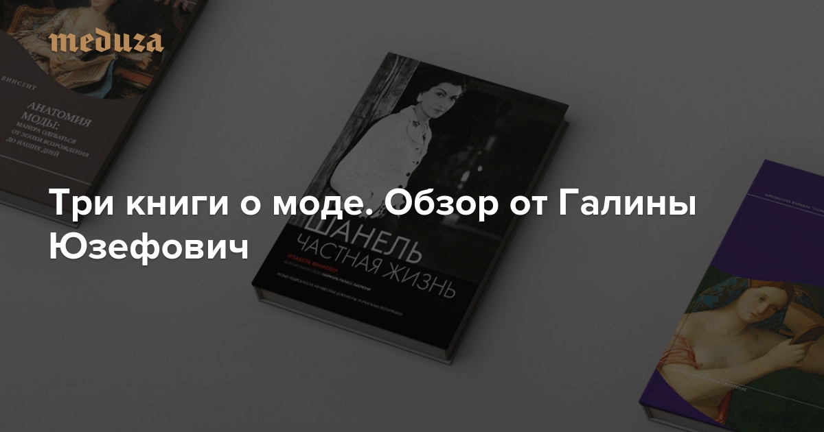 Еженедельно на «Медузе» литературный критик Галина Юзефович рассказывает о самых интересных книжных новинках, изданных в России. В новом обзоре все книги о моде — «Шанель. Частная жизнь» Изабель Фимейер, «Анатомия моды: манера одеваться от эпохи Возрождения до наших дней» Сьюзан Дж. Винсент и «Взгляд сквозь одежду» Энн Холландер.