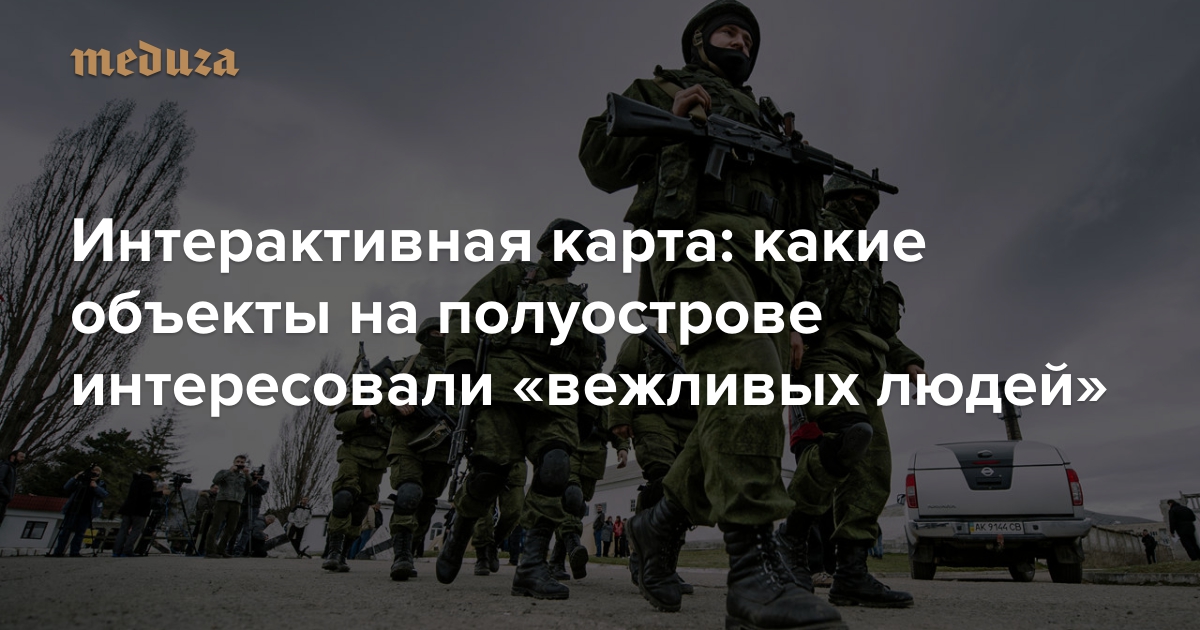 На медалях «За возвращение Крыма» (если верить неофициальным фотографиям) указаны даты: «20.02.2014–18.03.2014». В первую неделю этого периода происходила подготовка — в Крыму «вежливые люди» появились только в конце февраля. «Медуза» изучила сообщения о «зеленых человечках» в российской и украинской прессе и подготовила инфографику, которая позволяет понять, что именно блокировали и захватывали «вежливые люди» в первую очередь.