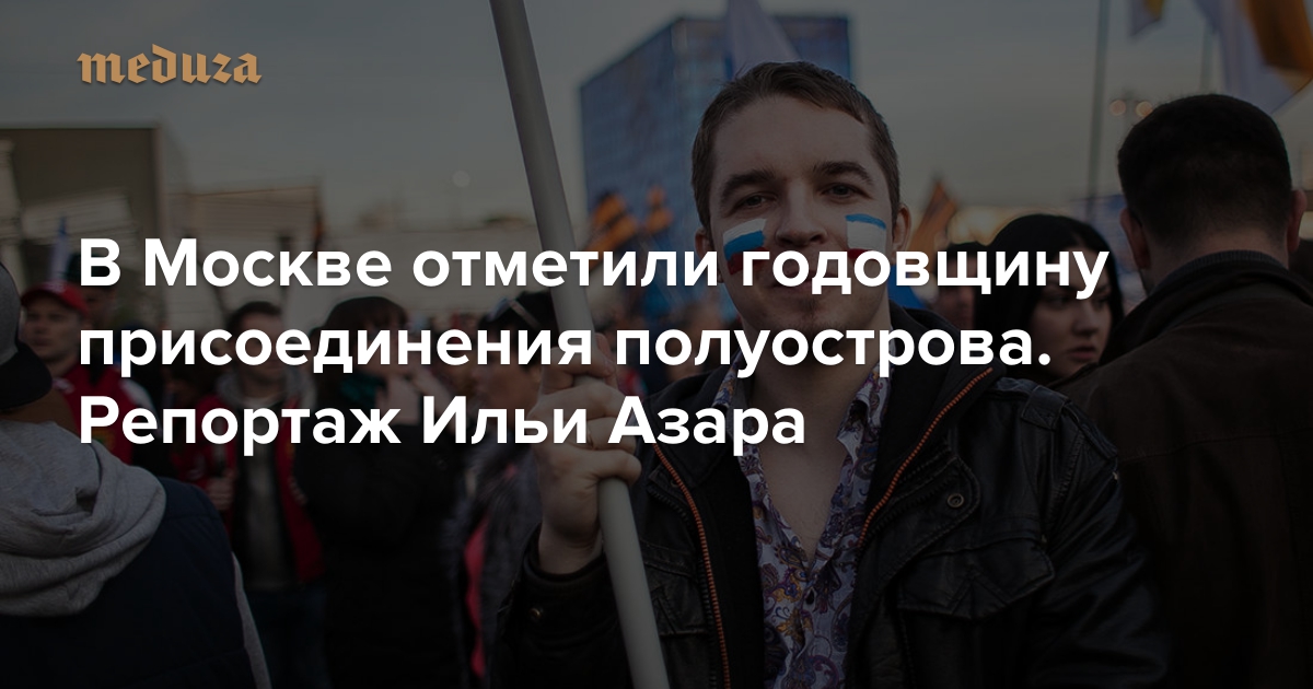 В Москве в первую годовщину присоединения Крыма и Севастополя к Российской Федерации прошел митинг-концерт на Васильевском спуске. По данным полиции, в разгар рабочего дня к Кремлю пришли 110 тысяч человек. Практически каждый выступавший со сцены подчеркивал значимость нового праздника для России и отмечал заслуги президента Владимира Путина в том, что в Крыму не случилось войны, как в Донбассе. Для собравшихся спели любимые артисты Путина и российского народа — Григорий Лепс и группа «Любэ», а сам президент произнес небольшую духоподъемную речь. Специальный корреспондент «Медузы» Илья Азар послушал пафосные речи политиков и пообщался со счастливыми посетителями митинга.