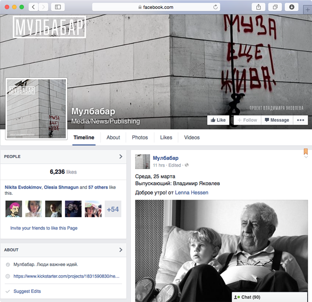— Вы знаете, я думаю, что по аудитории, которую хочется получить — можно. По тому, что очень хочется делать контент, который пользуется большим интересом — тоже можно. По степени нагрузки контента, по степени того, что контент несет — нет, конечно, нельзя. Хочется, чтобы тот контент, который будет производить «Мулбабар», был не менее популярен, но при этом более нагружен. Вот мой собственный недавний пост — обращение к журналистам — получил только у меня в ленте больше пяти тысяч перепостов. Даже без перепостов с той же «Медузы». Для текстового поста в фейсбуке — это очень, очень много. Контент, который несет сильный позитивный заряд и получает широкую аудиторию, вполне реален.