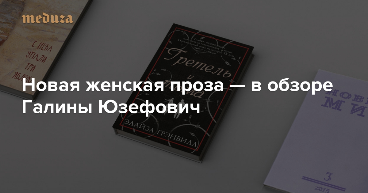 Еженедельно литературный критик Галина Юзефович рассказывает на «Медузе» о книжных новинках, выпущенных в России. В этом обзоре новинки от писательниц — «Автохтоны» Марии Галиной, «С неба упали три яблока» Наринэ Абгарян и «Гретель и тьма» Элайзы Гренвилл.