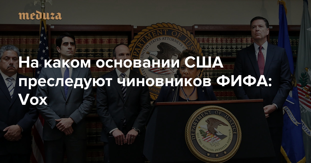 Министерство юстиции США 27 мая выдвинуло обвинения против 14 фигурантов дела о коррупции в Международной федерации футбола (ФИФА). Семеро из них по запросу американских властей были арестованы в Швейцарии. МИД РФ назвал эти аресты случаем «незаконного экстерриториального применения американского законодательства», а президент России Владимир Путин обвинил США в стремлении распространить свою юрисдикцию на другие государства. Vox объясняет, на каком основании американские власти преследуют функционеров международной организации.