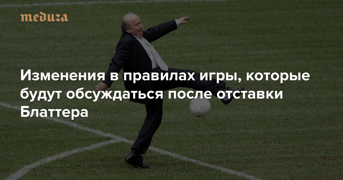 Порой это кажется незаметным, но футбольные правила постоянно меняются. Еще совсем недавно нельзя было представить, что на поле выйдут пятеро судей, а главный арбитр будет бегать с баллончиком с краской. Всего 20 лет назад была введена система трех замен, 23 года назад вратарям запретили брать мяч в руки после паса ногой от игроков собственной команды, четверть века назад изменилось правило офсайда, в 1970 году были введены красные и желтые карточки, а также серия пенальти в решающих играх. Возможно, с отставкой президента ФИФА Йозефа Блаттера, который неохотно вводил изменения в футбольные правила, нас ждут радикальные реформы. Журналист «Медузы» Александр Поливанов рассказывает, какие именно.