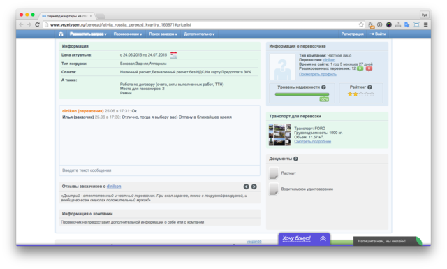 Первые предложения вышибают холодный пот: 33 400 рублей. Это очень много. Так и пишу. Торговля идет подозрительно легко: у проверенных перевозчиков (для этого есть специальная пометка. Если вы параноик, качество перевозчика можно уточнить у службы поддержки, они ответят) цена сбивается до 23 000 рублей. То есть на треть. Впрочем, 23 000 — это все равно много. Есть еще предложение за 20 000 р., но от непроверенного перевозчика.