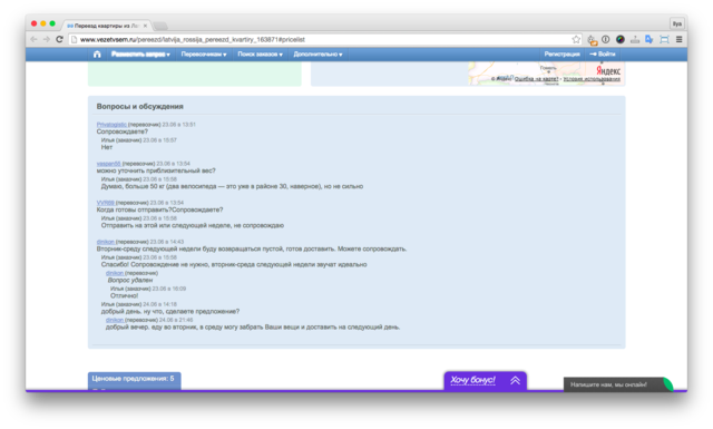 Сервис «Везёт Всем» работает крайне понятно — заходишь, регистрируешься, описываешь заказ — ждешь, пока поступят предложения. Дальше все зависит от вас: общайтесь, сравнивайте цены, выбирайте. Интерфейс сайта немного перегружен — можно запутаться, но это не большая беда. Грузчики на «Везёт Всем» умеют перевозить что угодно, кроме того есть «муверы» — те, кто перевозят квартиры полностью: упаковывают, разгружают, перевозят, выгружают, поднимают и распаковывают все вещи.