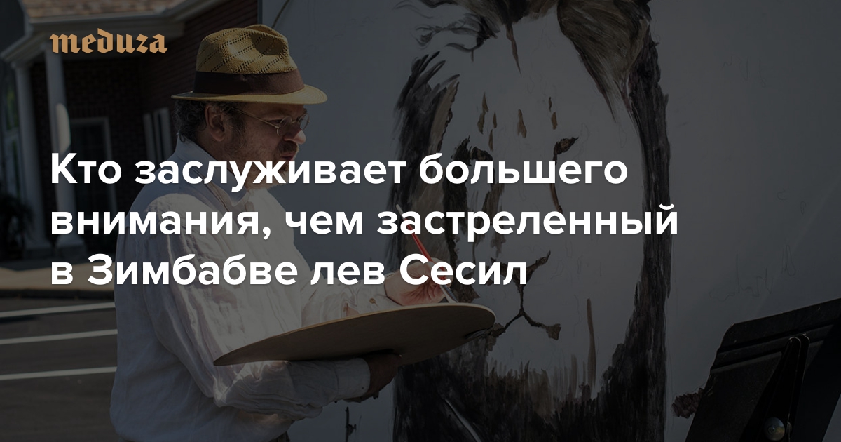 В конце июля мы узнали про легендарного зимбабвийского льва Сесила и про жестокого американского дантиста Уолтера Палмера, который этого льва застрелил. Палмер утверждал, что он понятия не имел ни о популярности льва (Сесил был главным животным в национальном парке Хуэндж), ни о незаконности охоты, но его все равно теперь все ненавидят. На фоне массовой скорби по льву многие британские и американские издания возмутились: как можно шуметь по поводу одного африканского животного и не обращать внимания на куда более серьезные проблемы? «Медуза» выбрала главные темы, которые, по мнению журналистов и активистов, незаслуженно оказались в тени из-за истории с Сесилом.