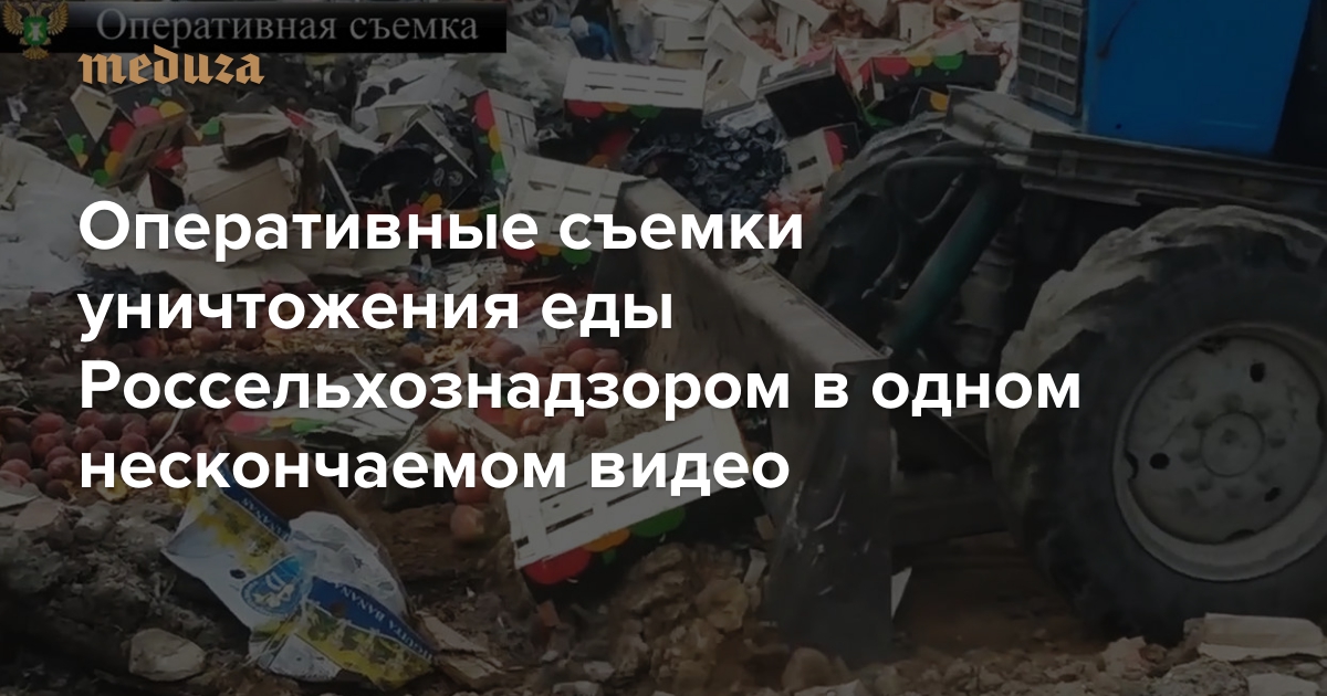 С 6 августа, когда в действие вступил указ о ликвидации всей санкционной и контрабандной еды, в интернете начали появляться оперативные съемки уничтожения продуктов — гусей в мусорку, говядину в печь, яблоки под трактор, персики под самосвал. Особенно усердствует официальный канал Россельхознадзора в Youtube — там появляется по несколько роликов в день. Чтобы не засомневаться в том, что все это происходит и транслируется на самом деле, «Медуза» составила из видео Россельхознадзора и нескольких телеканалов один нескончаемый ролик.