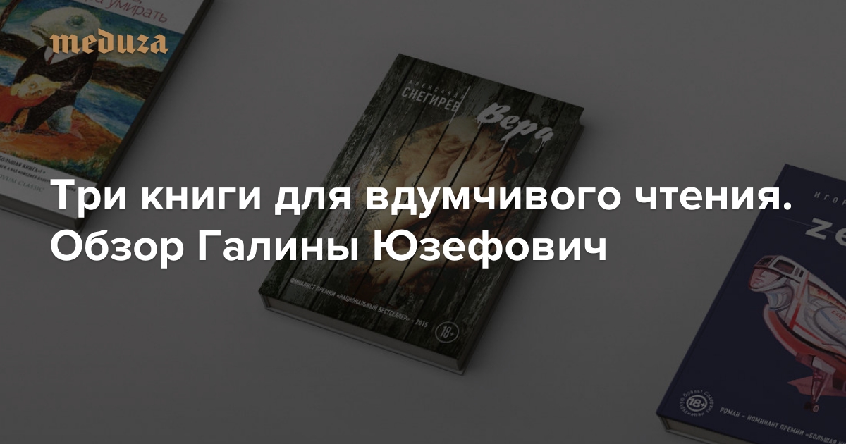 Литературный критик Галина Юзефович рассказывает на «Медузе» о самых интересных книжных новинках, изданных в России. В сегодняшнем обзоре — три романа трех относительно молодых российских авторов, явно рассчитанных на попадание в премиальные чарты и вообще — на вдумчивый читательский взгляд: «Zевс» Игоря Савельева, «Зачем жить, если завтра умирать» Ивана Зорина и «Вера» Александра Снегирева.