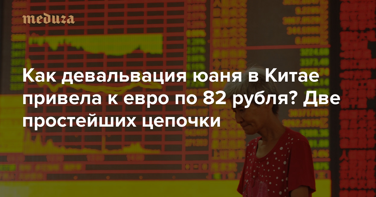 На мировых фондовых рынках «черный понедельник»: утром обвалились азиатские фондовые индексы, вслед за ними — европейские, а потом и американские. Чего-то такого инвесторы ждали уже несколько недель: неожиданная девальвация китайского юаня и падение стоимости сырья выявили переоцененность и других биржевых товаров. «Медуза» на двух простейших цепочках объясняет, что случилось, и как связана девальвация китайской валюты с тем, что евро в Москве стоит уже 82 рубля.