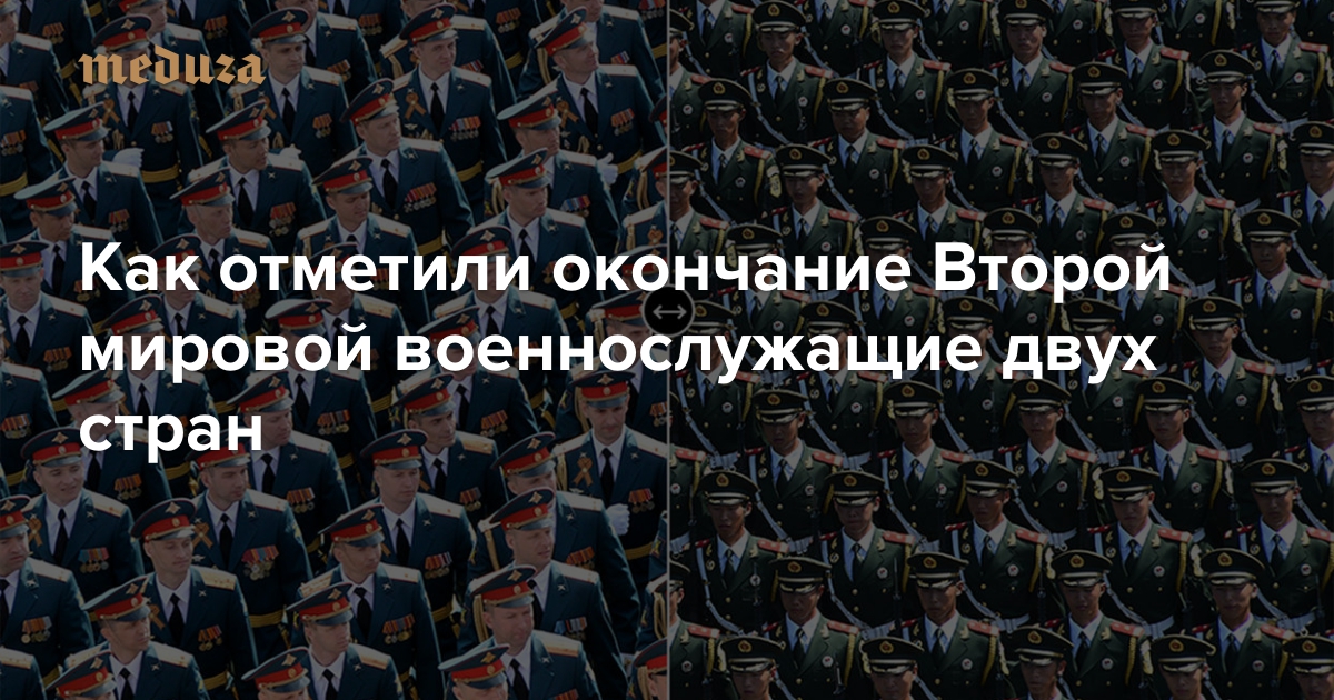 Дополнить сравнение «Медуза» предлагает читателям самостоятельно: каждая из картинок ниже состоит из двух, с помощью слайдера можно перемещаться влево и вправо. Слева — парад в Москве, справа — парад в Пекине.