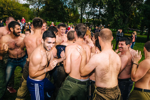 На поляне, сняв футболки, борются десятки крепких парней. В нескольких десятках метров от них группа молодых людей практикуется в метании ножей. Две девушки собирают подписи за запрет абортов. В палатке продают варенье из Горловки (город на территории самопровозглашенной Донецкой народной республики). На соседней поляне — конкурс православного граффити. Все это происходит в той части Коломенского, где каждый год стоит фудкорт «Пикника Афиши».