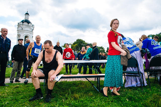 Возле металлического ограждения стоит хмурый мужчина в красной футболке с символикой движения «Сорок сороков» (русский богатырь с щитом и мечом на фоне церковных куполов). Алексей ковыряется в телефоне, не обращая внимания на то, что происходит вокруг — в Коломенском проходит фестиваль «Православие и спорт», организованный движением при поддержке Русской православной церкви и в рамках празднования тысячелетия со дня смерти князя Владимира.
