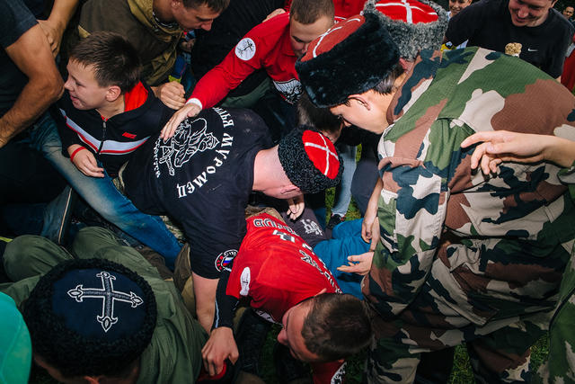 Среди «крепких ребят» в Торфянке был, например, Иван «Комбат 18» Катанаев, бывший руководитель «Фратрии» — самой мощной группировки фанатов московского «Спартака». В недавнем интервью Катанаев говорил, что долгое время симпатизировал фашистской идеологии — оттуда и его прозвище (Combat 18 — британская праворадикальная группировка, 18 используется для обозначения имени Адольф Гитлер).