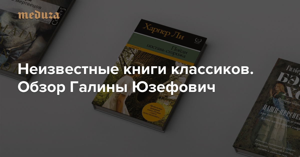 Еженедельно литературный критик Галина Юзефович рассказывает на «Медузе» о самых интересных книжных новинках, изданных в России. В нынешнем обзоре представлены неизвестные романы классиков мировой литературы: «Пойди поставь сторожа» Харпер Ли, «Бэзил Хоу» Гилберта Кийта Честертона и «Вино мертвецов» Ромена Гари.