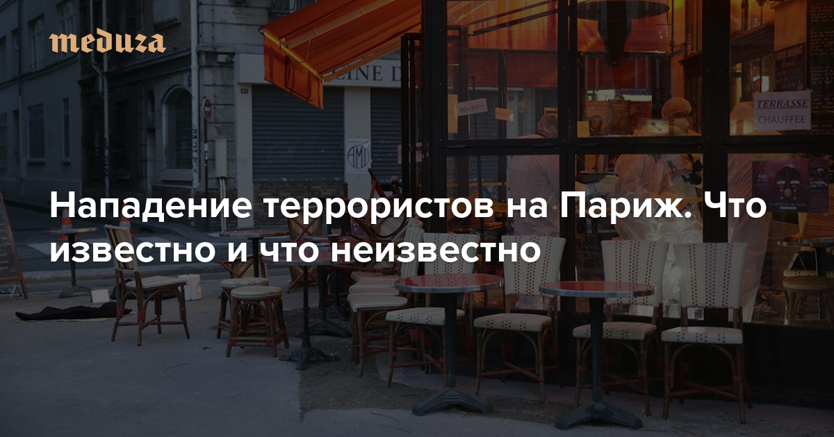 Вечером 13 ноября в Париже произошла крупнейшая в истории Франции серия террористических актов. Рядом со стадионом «Стад де Франс» террористы подорвали несколько бомб, в концертном зале «Батаклан» убили десятки человек и удерживали граждан, в нескольких кафе открыли огонь. «Медуза» рассказывает, что известно и что неизвестно к утру субботы о нападении террористов на столицу Франции.