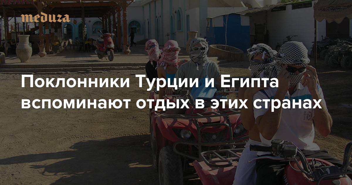 Российские власти фактически закрыли для граждан два самых популярных туристических направления: Египет — после теракта на борту A321, Турцию — после того, как местные военные сбили российский Су-24. Две эти страны — не просто популярные варианты для отдыха граждан РФ, за последние 25 лет они стали главным способом их знакомства с заграницей. По просьбе «Медузы» журналистка Ани Оганесян поговорила с туристами, которые были и остаются — несмотря на политику — настоящими фанатами этих стран.