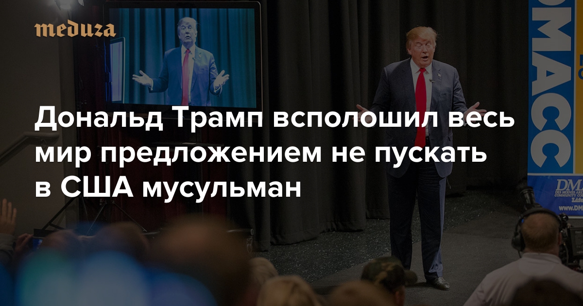7 декабря 2015 года Трамп предложил закрыть всем мусульманам въезд в США. Первоначально в заявлении говорилось, что запрет должен коснуться даже американских граждан, исповедующих ислам, но затем Трамп оговорился, что речь идет только об иностранцах. Заявление кандидата в президенты США было опубликовано в письменном виде, что исключает вероятность какой-то ошибки или неверной интерпретации.