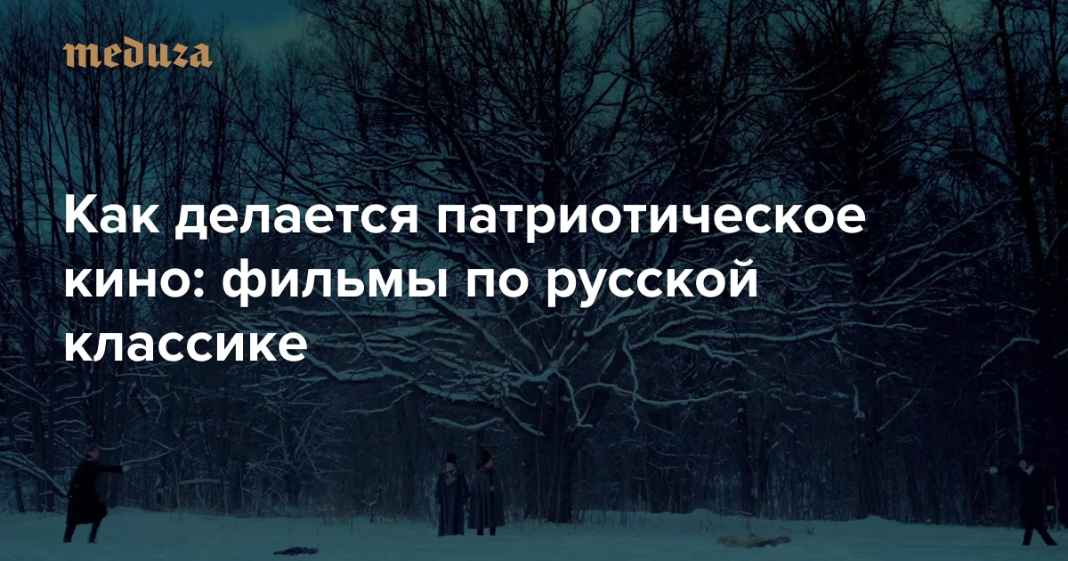 В 2014 году в России были утверждены основы государственной культурной политики, в 2015-м разрабатывалась ее стратегия. На культуру наложена определенная миссия — она должна формировать систему ценностей и поведенческих норм, развивать патриотические чувства и отвечать интересам государства. По выполнению патриотического плана самым плодотворным из искусств оказался кинематограф — что только ни сняли режиссеры за последние несколько лет, обратившись и к классической литературе, и истории. Кинокритик Сергей Синяков по просьбе «Медузы» неделю смотрел самое разное патриотическое кино последних лет, изучал темы и приемы на конкретных примерах. В первом обзоре из серии — три картины, снятые (или придуманные) по классике: «Бесы» Владимира Хотиненко, «Солнечный удар» Никиты Михалкова и «Дуэль Пушкинъ — Лермонтовъ» Дениса Банникова.