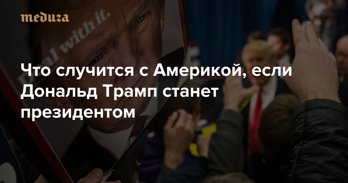 Кандидат в президенты США от Республиканской партии Дональд Трамп одержал свою первую настоящую победу, победив на праймериз в Нью-Гемпшире 9 февраля. Эксцентричного миллиардера и ведущего реалити-шоу поддержали 35% голосовавших, а губернатор штата Огайо Джон Кейсич, ближайший конкурент Трампа на голосовании в Нью-Гемпшире, не набрал даже 16%. Вопрос, сможет ли Дональд Трамп превратить личную популярность в голоса избирателей, больше не актуален — теперь впору задаваться вопросом, что будет, если Трамп станет 45-м президентом США. «Медуза» изучила основные точки зрения на этот счет.