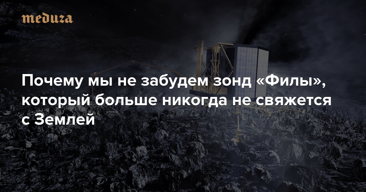 12 февраля официально объявили, что ученые перестанут посылать сигналы зонду «Филы», который находится на комете Чурюмова-Герасименко. Он остался на холодной комете в одиночестве и в темноте. Путь «Филы» был долгим и героическим — «Медуза» рассказывает про то, что пришлось пережить 100-килограммовому малышу в космосе.