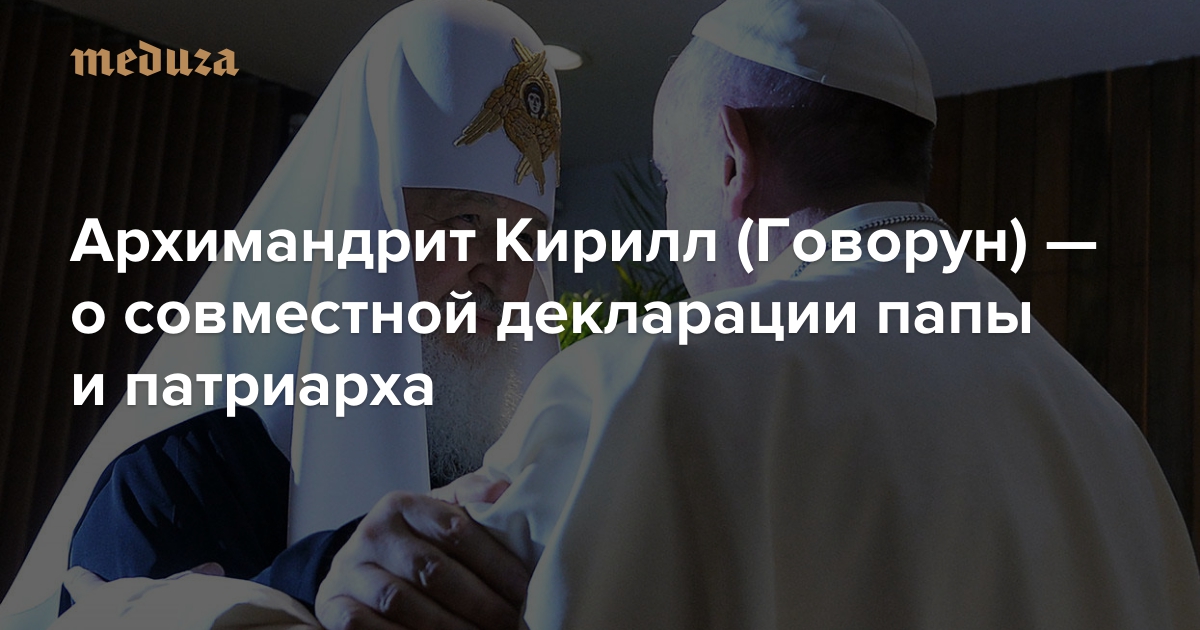В ночь на 13 февраля на Кубе прошла первая в истории встреча предстоятеля Русской православной церкви и папы римского. Она завершилась подписанием совместной декларации, состоящей из 30 пунктов. «Медуза» попросила доктора богословия, архимандрита Кирилла (Говоруна) рассказать, на что нужно обратить внимание в этом историческом документе прежде всего.