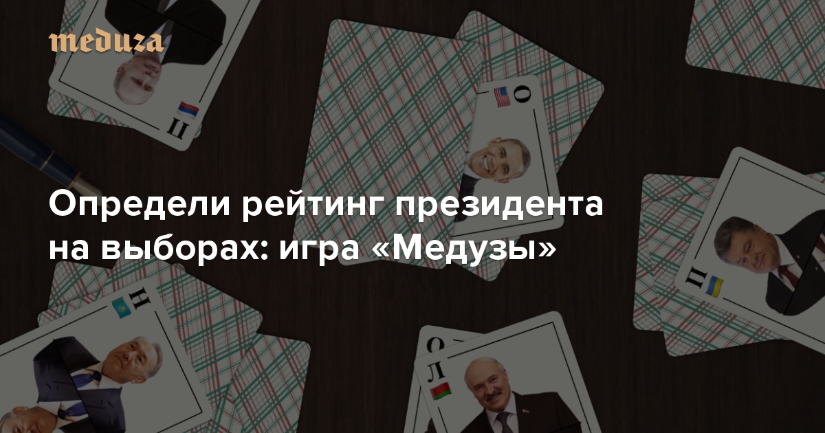 4 марта вышел четвертый сезон любимого сериала Барака Обамы «Карточный домик». В предыдущих трех сезонах политик Фрэнк Андервуд с помощью интриг, убийств и политических махинаций становится президентом США, в четвертом — будет бороться за то, чтобы остаться на этом посту. К премьере «Медуза» придумала игру про мировых лидеров. В ней вам придется делать то, чем обычно занимаются руководители государств — меряться рейтингами. Правда, для этого нужно знать, у кого из мировых лидеров рейтинг выше.