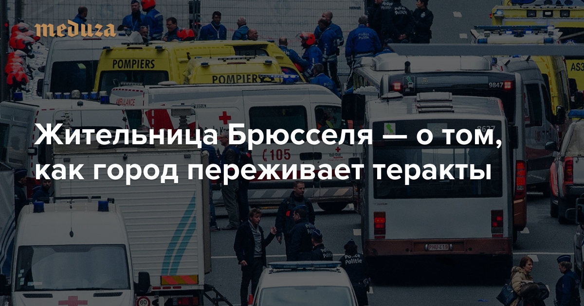 Утром 22 марта в Брюсселе произошла серия терактов: взрывы прогремели в аэропорту Завентем и на станции метро «Мальбек» в центре города. По предварительным данным, погибли 34 человека, около 200 получили ранения. Ответственность взяли на себя террористы из запрещенной в России организации «Исламское государство». Бельгийские власти ввели высший уровень террористической угрозы, аэропорт закрыт, городской транспорт не работает. По просьбе «Медузы» жительница Брюсселя, журналист Анастасия Валеева рассказывает о том, как город переживает теракты.