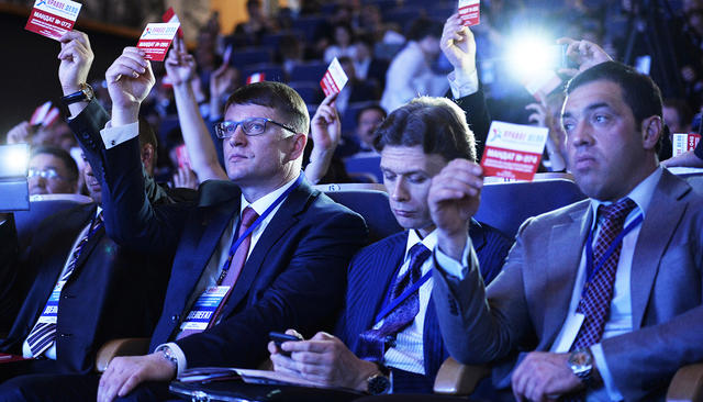 Последний съезд в истории партии «Правое дело» проходил 26 марта в конференц-зале МГИМО. Он начался с выступления ее председателя, уполномоченного при президенте РФ по правам предпринимателей Бориса Титова. «Сегодня вся страна под угрозой, сегодня [бизнесменам] надо опять идти в политику, потому что нужно менять экономику», — сказал он, открывая съезд.
