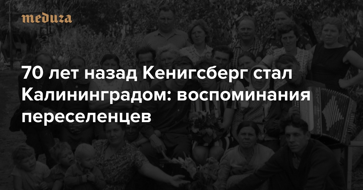 В апреле 2016-го исполнилось 70 лет Калининградской области. Советские войска заняли Кенигсберг в 1945-м, и по решению Потсдамской конференции летом того же года эта территория — северная часть Восточной Пруссии — отошла СССР. В 1946 году Верховный Совет СССР переименовал область из Кенигсбергской в Калининградскую, а Сталин сформулировал тезис о том, что здесь — «исконно славянская земля». После этого началось массовое переселение в область советских граждан из других регионов страны. Несколько лет они жили вместе с немцами; в 1947–1949 годах больше ста тысяч немцев были депортированы. Исследователи под руководством историка Юрия Костяшова записали воспоминания первых переселенцев в Калининградскую область еще в 1990-х, а сейчас драматург Нана Гринштейн работает над документальной пьесой по этим материалам. С разрешения авторов «Медуза» публикует выдержки из интервью, посвященные тому, как восстанавливалась область после войны, каковы были отношения между немцами и приезжими, и чем Калининградская область отличалась от других мест СССР.