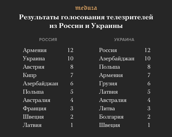 Украинцы голосовали за Лазарева, россияне — за Джамалу. Зрительское голосование значительно отличалось от выбора национальных жюри. На Украине лучшей песней «Евровидения-2016» посчитали композицию Сергея Лазарева. В России народное голосование отдало первое место певице из Армении, но следом за ней сразу шла Джамала.